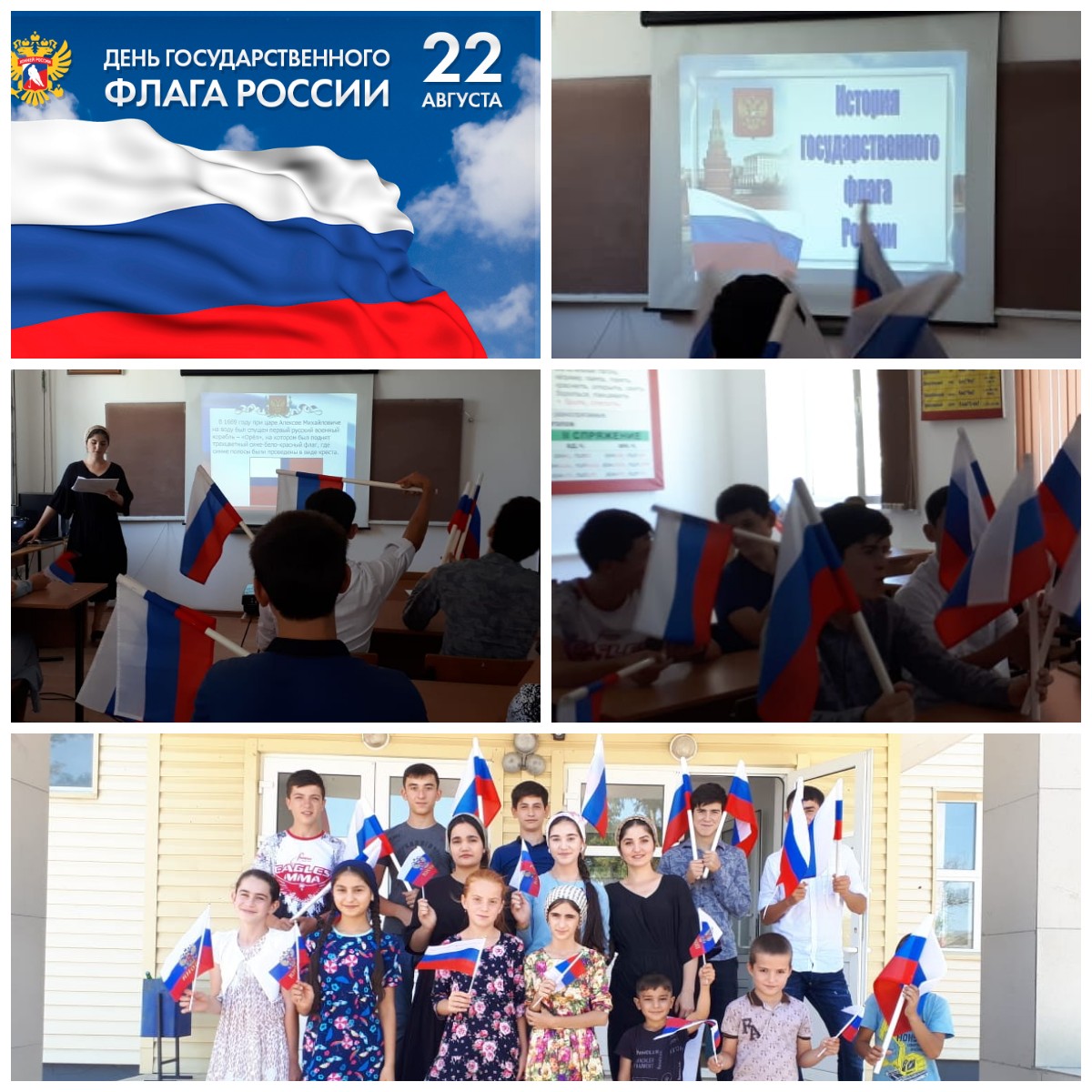 22.08.2019Ко Дню флага России для детей посещающих "Летнюю Площадку" организовани и проведен небольшой экскурс в историю (урок-презентация "День флага"). учитель инфлорматики Жантаева З.Р. познакомила детей с историей ваозникновения Красной даты в календаре. После урока ребята вышли на улицу и исполнили гимн РФ для всех желающих послушать.
