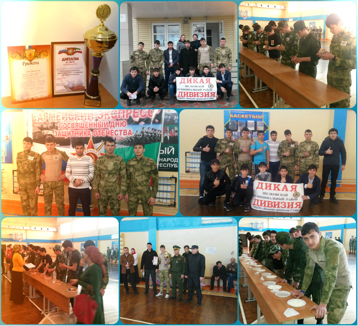 18.02.2016После уверенной победы в районном этапе конкурса «Армейский экспресс», посвященном Дню защитника Отечества, команда «Дикая дивизия» в составе Акбернова Муслима Рамзановича, Истарбаева Рамзана Магомедовича, Шамилова Зелимхана Умаровича и Эскерханова Висхана Хасановича приняла участие 18.02.2016 г. в Республиканском этапе конкурса.