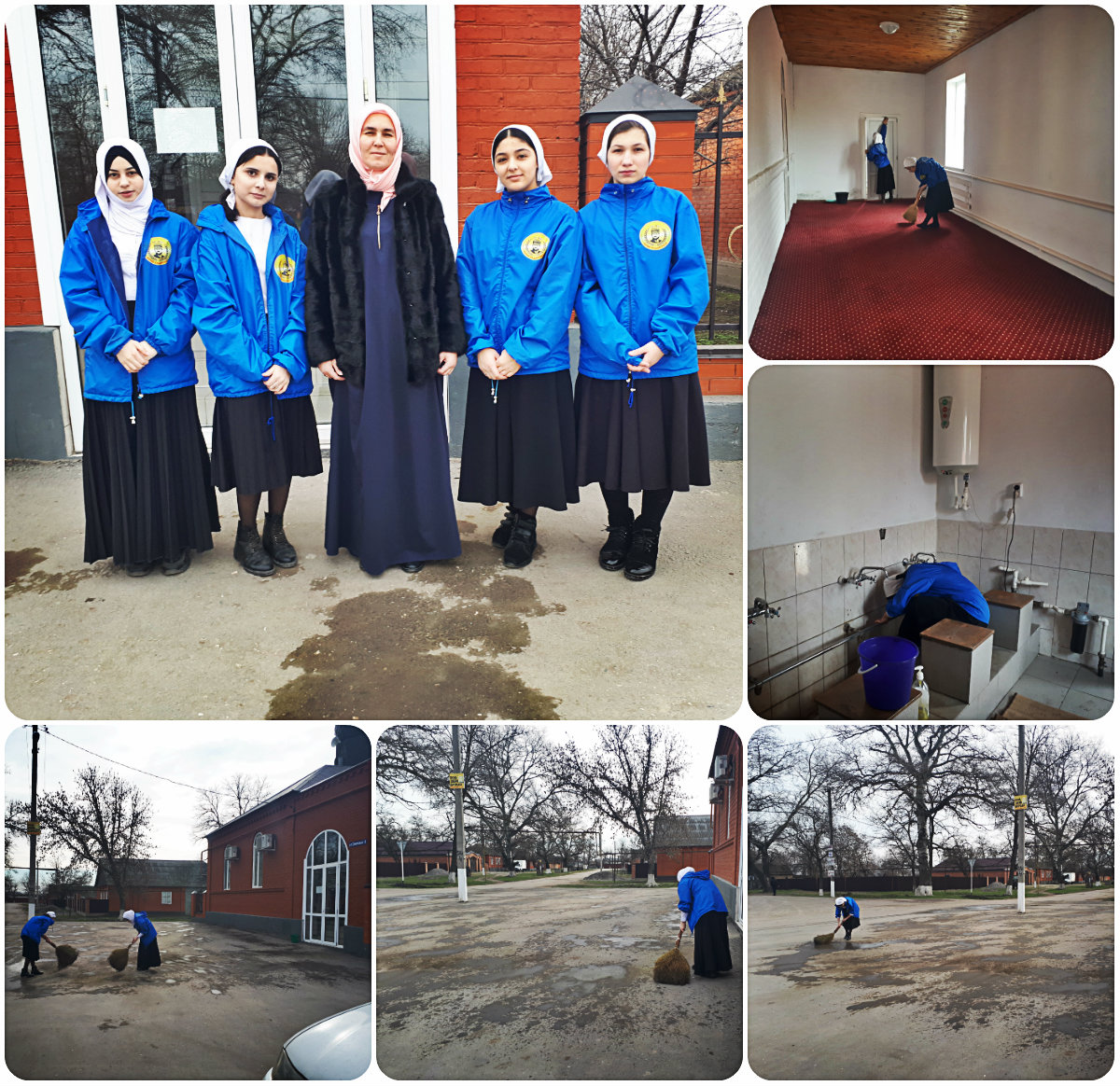 Девочки помыли используемые для малого омовения принадлежности, провели сухую и влажную уборки внутри помещения, подмели прилегающую к мечети площадку, убрали мусор в небольшом дворике при мечети.