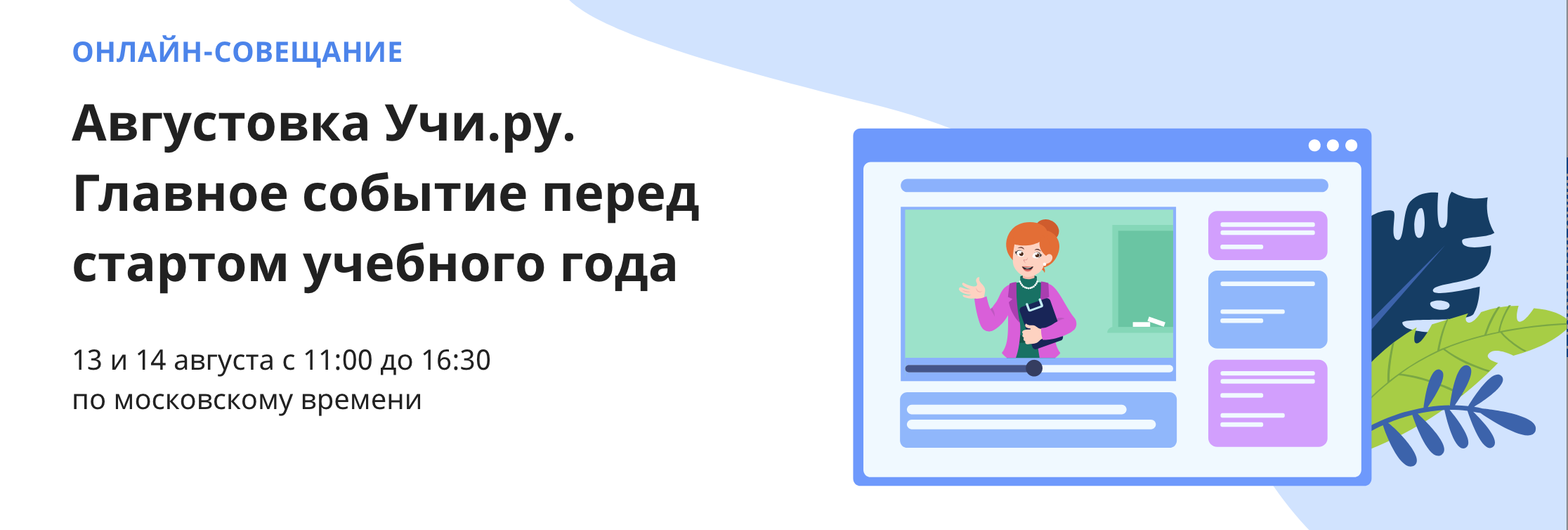 13 и 14 августа в режиме онлайн пройдет первое открытое всероссийское совещание-конференция Августовка Учи.ру. Главное событие перед стартом нового учебного года. На нем выступят представители Учи.ру, НИУ ВШЭ, Российского движения школьников, АНО «Россия — страна возможностей», конкурса «Учитель будущего», мастерской управления «Сенеж», центра цифрового развития «Точка роста», победители всероссийских педагогических конкурсов и многие другие.