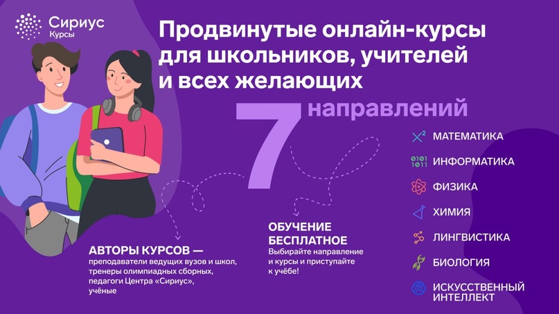 Команда авторов и методистов Сириус.Курсов продолжаетформировать полную линейку курсов по естественно-научным предметамс 7 по 11 класс. Все курсы разрабатываются в единой концепции,проходить их можно в удобном темпе, выстраивая собственнуюобразовательную траекторию.